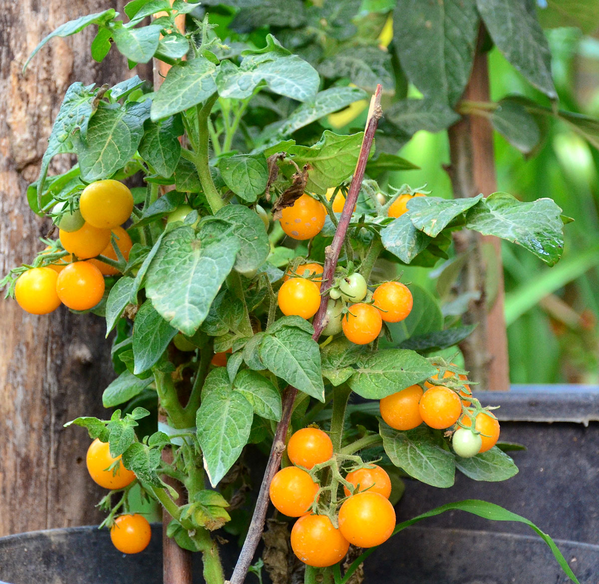 Tomatele Cherry Galbene formează ciorchini de fructe de culoare galben intens.