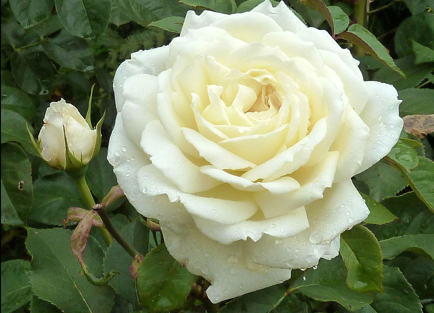Trandafir tehibrid viguros, cu frunziș bogat, ce creează un elegant contrast cu florile albe sau, uneori, albe cu centrul discret crem.